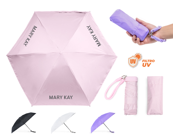 Paraguas de bolsillo de 6 gajos con protección de rayos UV, cintillo de contacto, botón de apertura manual, eje y varillas de metal. Cuenta con mango rectangular y jareta desmontable del color del paraguas. Incluye funda individual. Presentación: caja kraft.