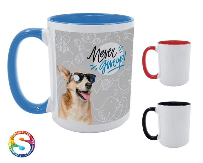 Tarro bicolor blanco para sublimación con asa e interior en color diferente. CAP. 15 OZ. Venta en múltiplos de 12.
