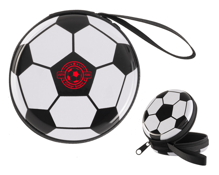 Estuche monedero en forma de balón de soccer, cuenta con cierre lateral y jareta.