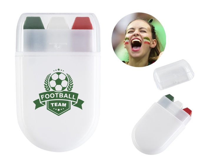 Barra de pintura facial tricolor en verde, blanco y rójo; cuenta con estuche de plástico con tapa para su fácil aplicación y manejo.