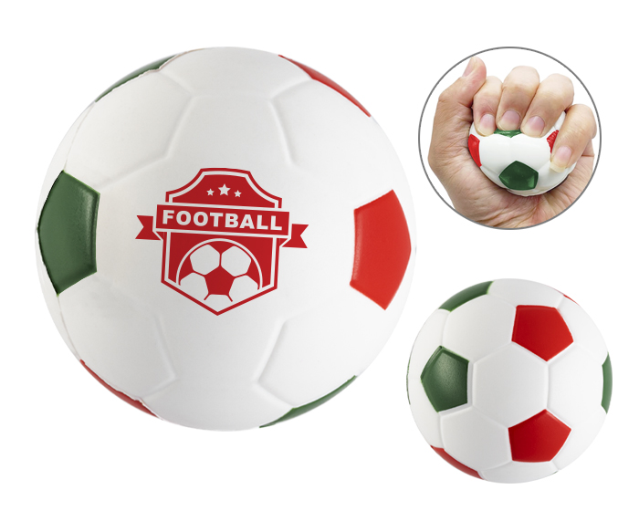 Pelota antiestrés tricolor de alto rebote, en forma de balón de fútbol soccer.
