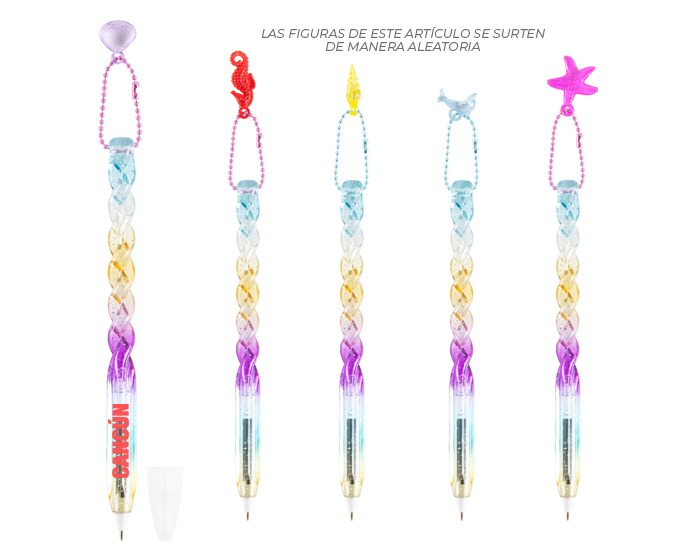 Bolígrafo de plástico transparente tornasolado con glitter, hacia la punta es de forma cuadrada, para una mejor área de impresión y sujeción; de la parte media y superior forma un original trenzado del que se sujeta un dije con motivos marinos (5 colgantes diferentes, surtidos de manera aleatoria). Cuenta con tapa transparente. Es ideal como souvenir en zonas de playa.